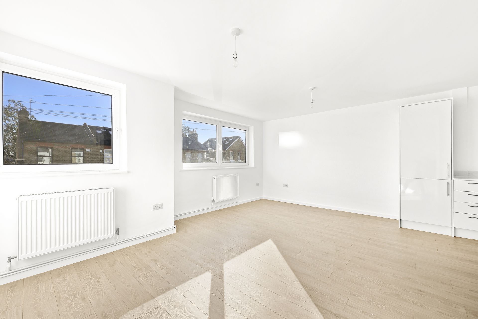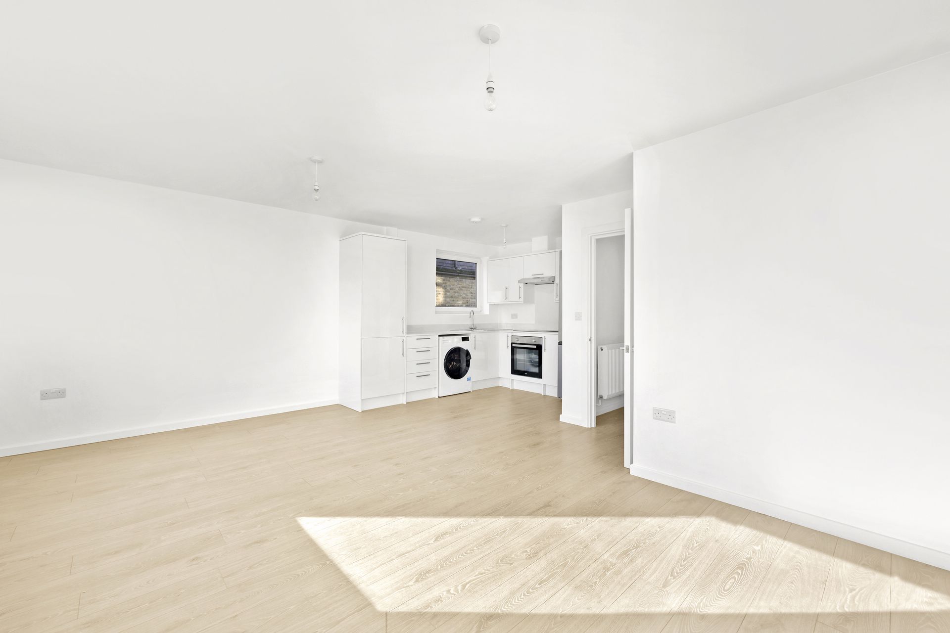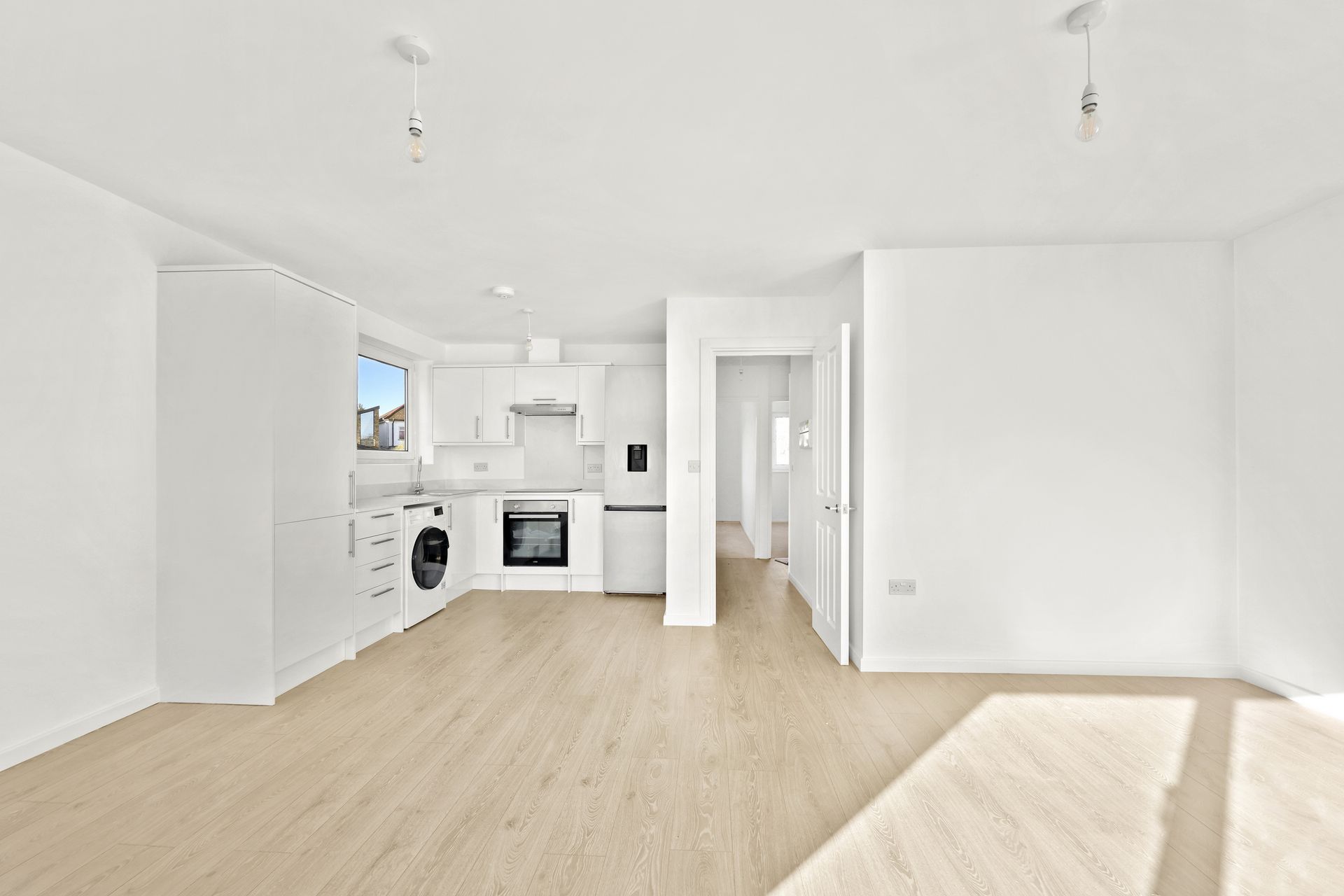 The property features a large open-plan kitchen/living area with fantastic natural light, a modern bathroom suite, a generous master bedroom, and a well-proportioned second bedroom.