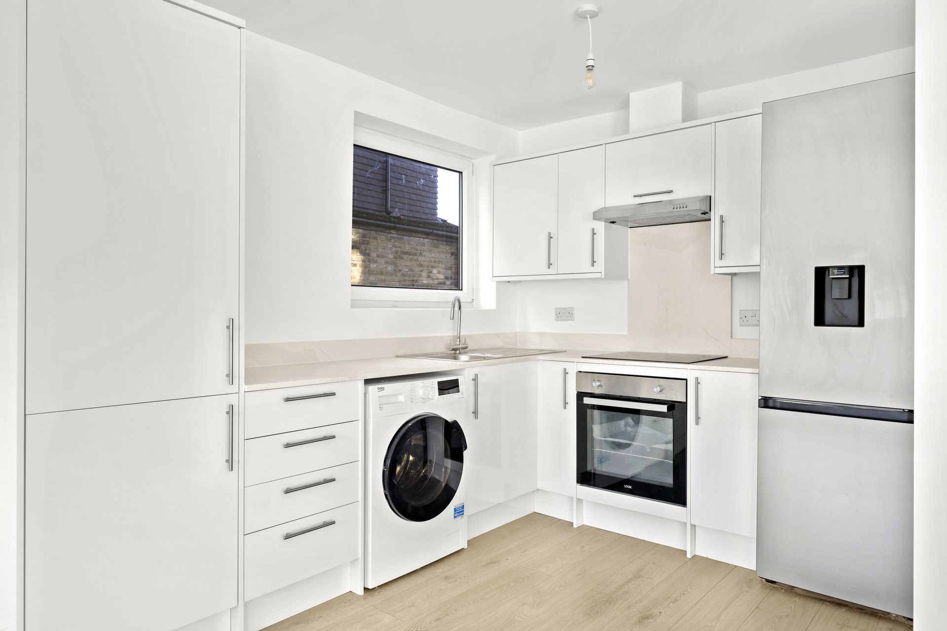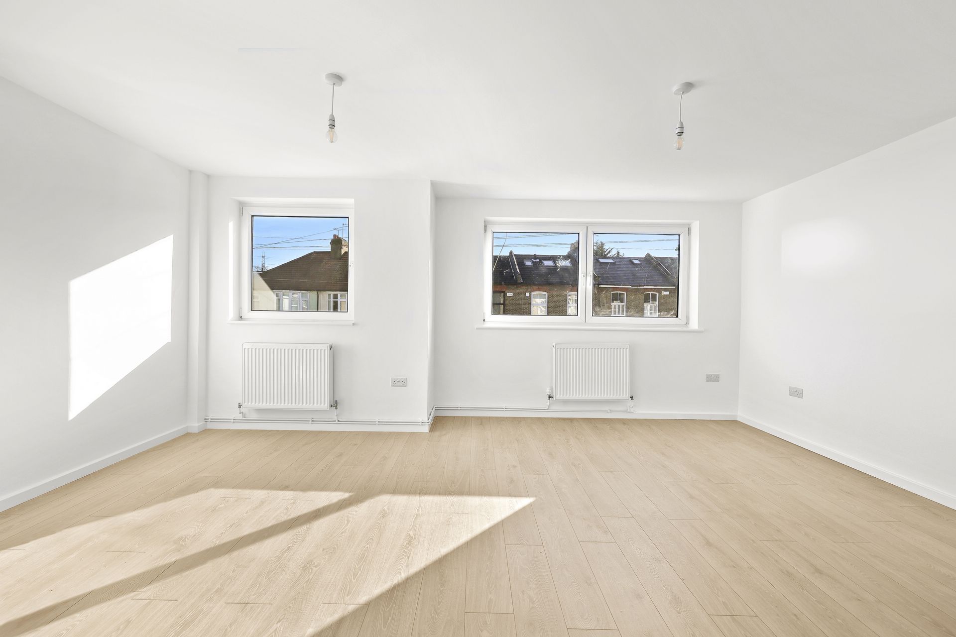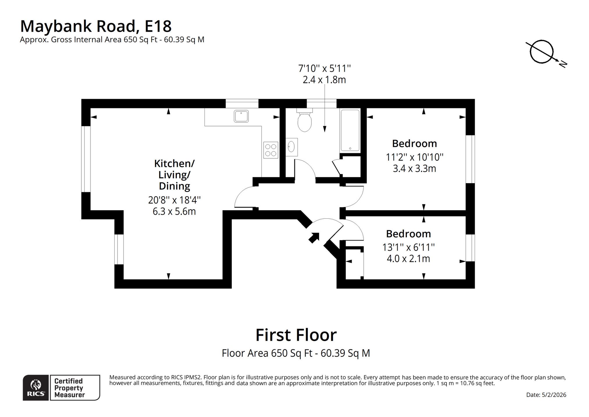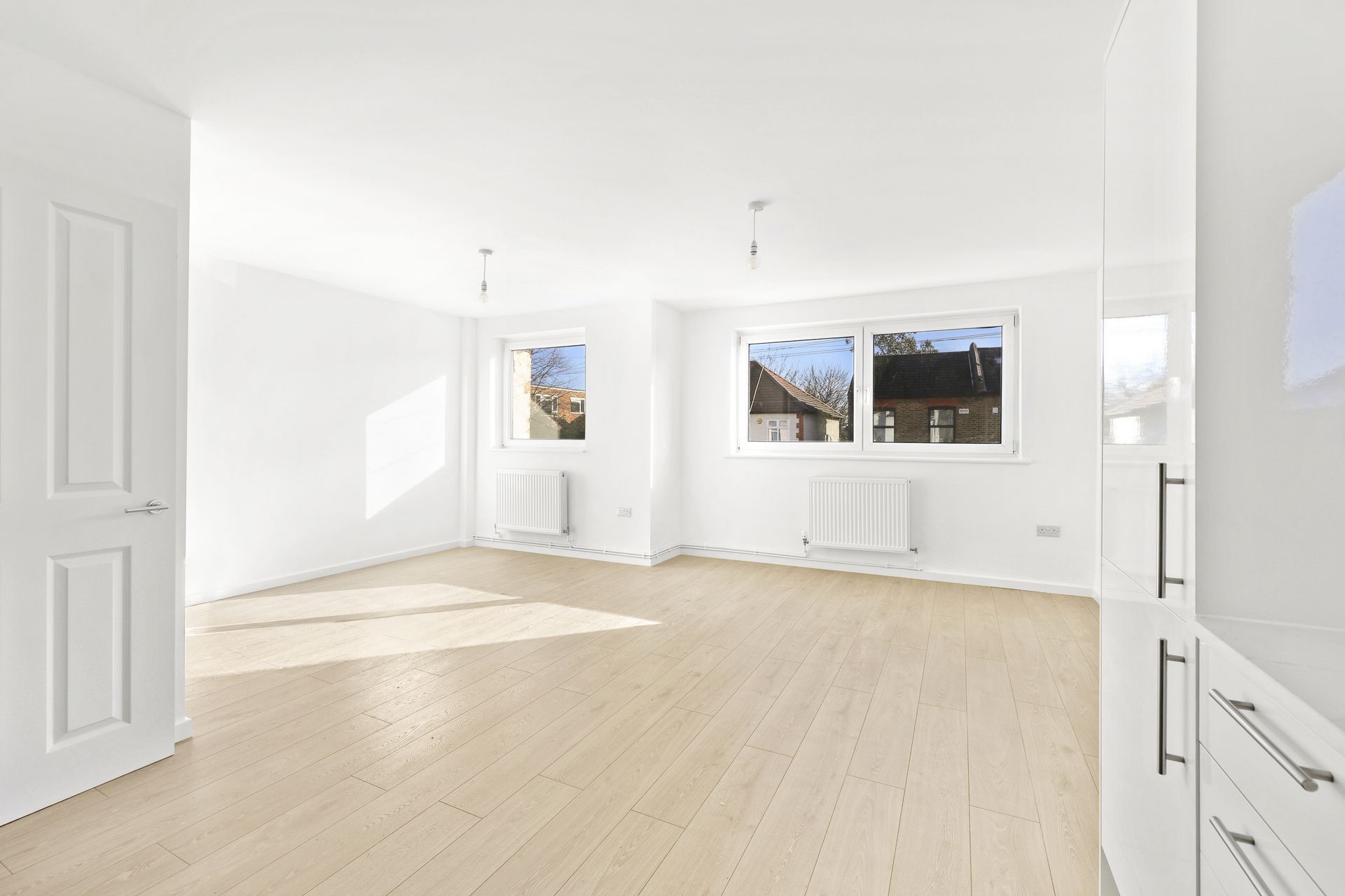 The property features a large open-plan kitchen/living area with fantastic natural light, a modern bathroom suite, a generous master bedroom, and a well-proportioned second bedroom.